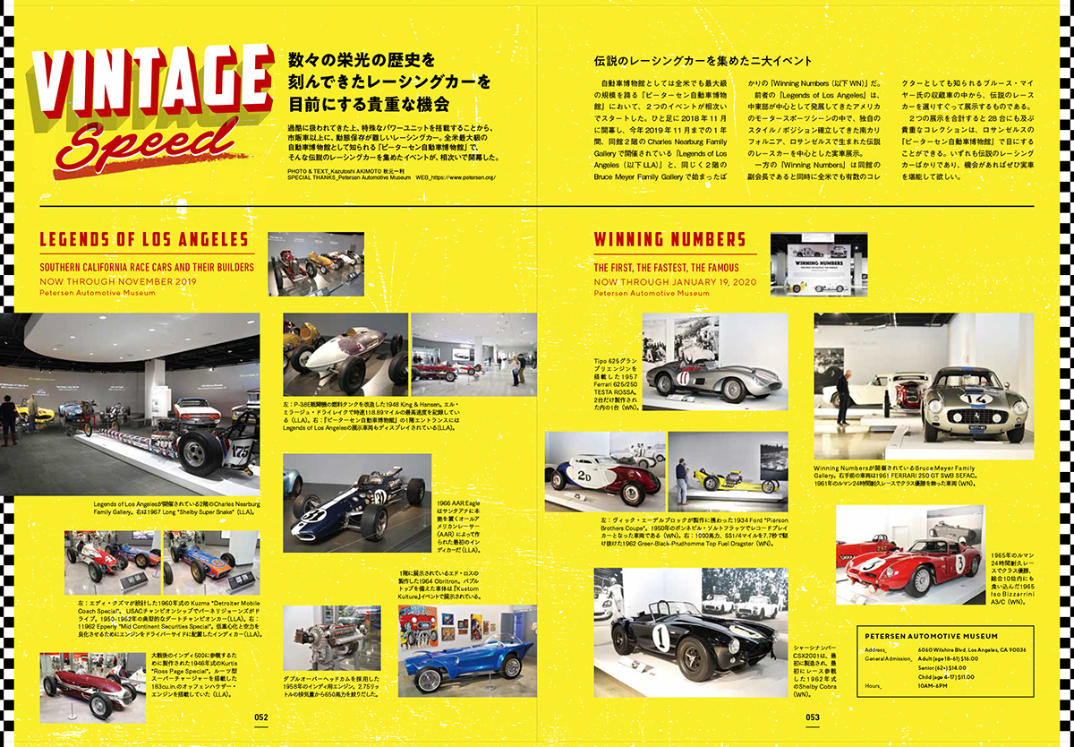 ほかにもロサンゼルスで開催されている伝説のレーシングカーの展示イベントや連載企画の『カリフォルニア・キュイジーヌ』など、今号も見逃せない記事が満載!