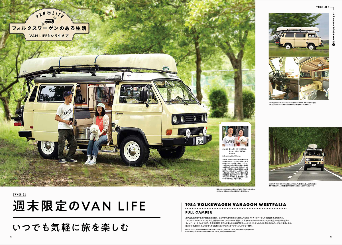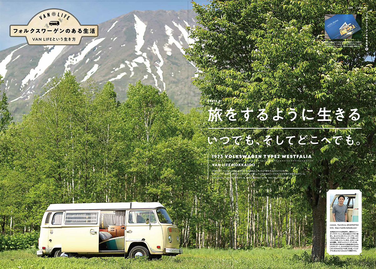また第二特集はVol.05に続く『VAN LIFE』第二弾。今回は北海道を各地を転々とし、レイトバスで旅をしながら生活をしているオーナーさんや、ご夫婦+愛犬と一緒に週末をバナゴンで旅する週末限定のVAN LIFEを取材させていただきました。