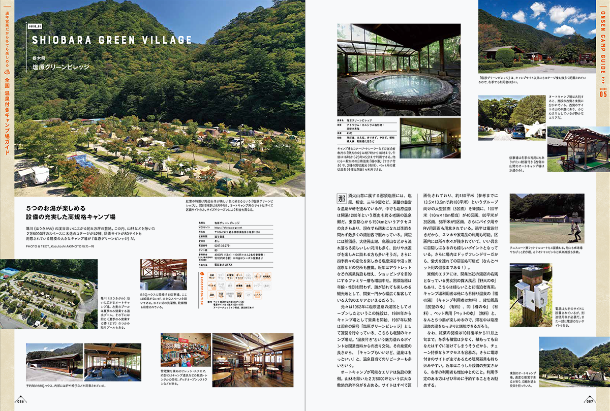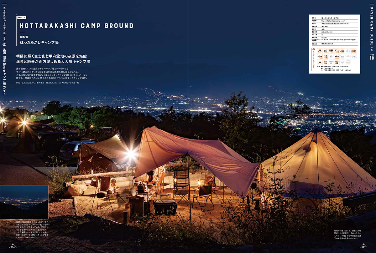また第2特集は「全国(通年営業の)温泉付きキャンプ場」特集。北海道から九州・指宿まで、編集部がひとつひとつ丁寧に取材をしてきました。