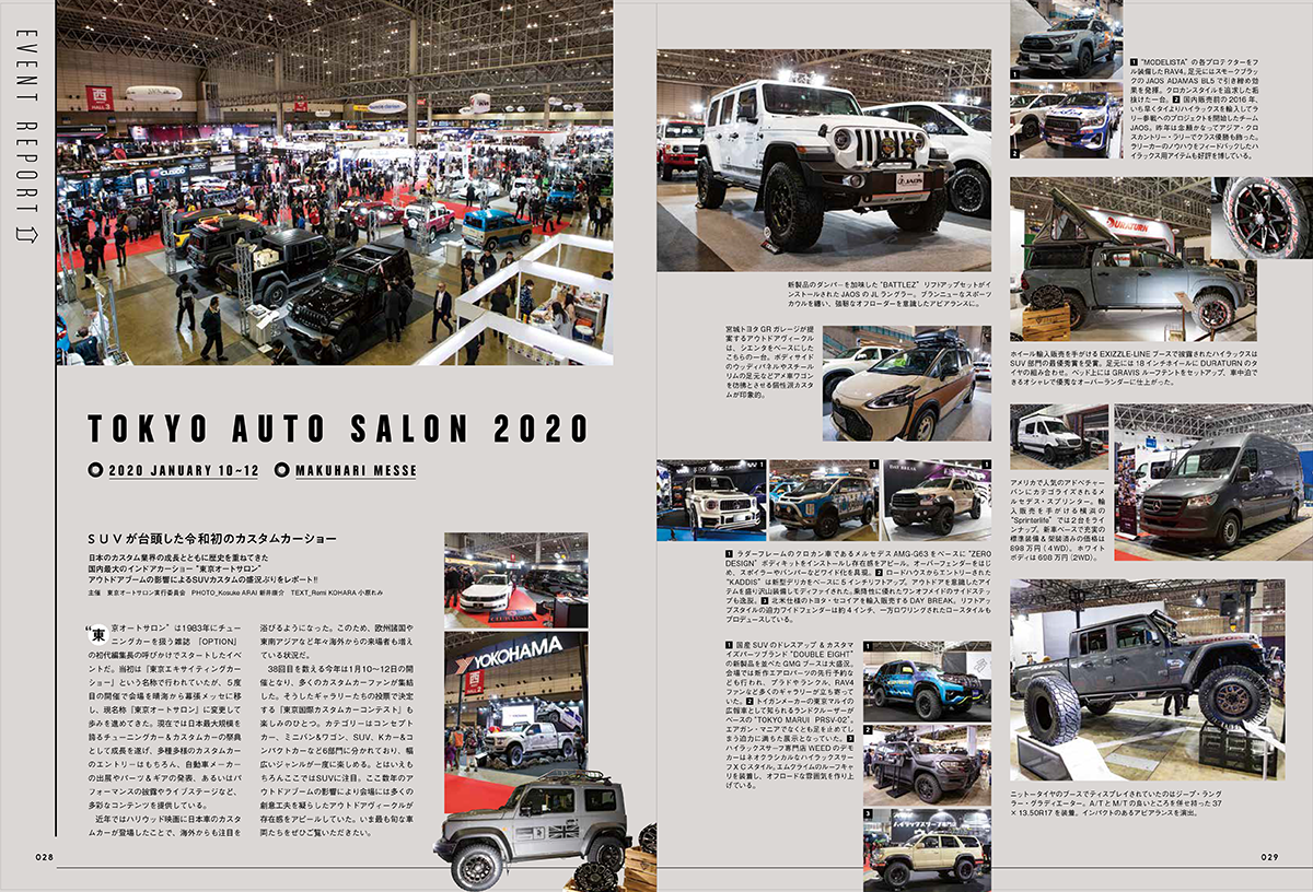 巻頭部では『東京オートサロン2020』でデビューした最新の1台を収録した他、全ページ1台1台をアルバム形式で詳細に紹介。キャンプに最適なトランスポーター探しはもちろん、人気のSUVカスタムの参考としても役立つ1冊です。