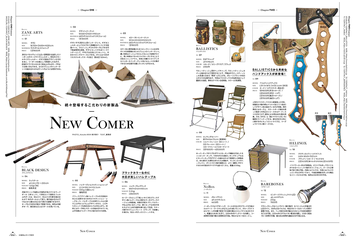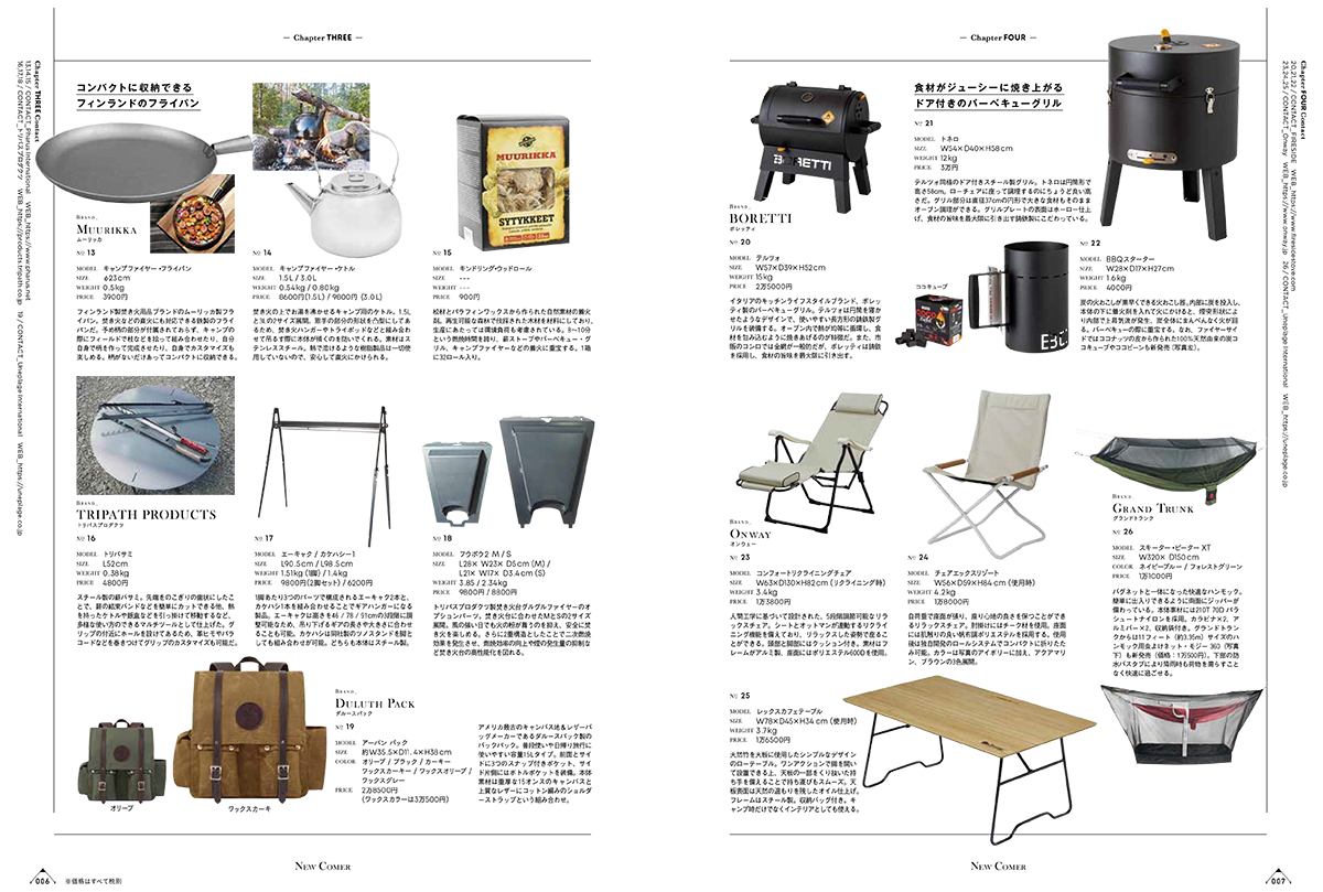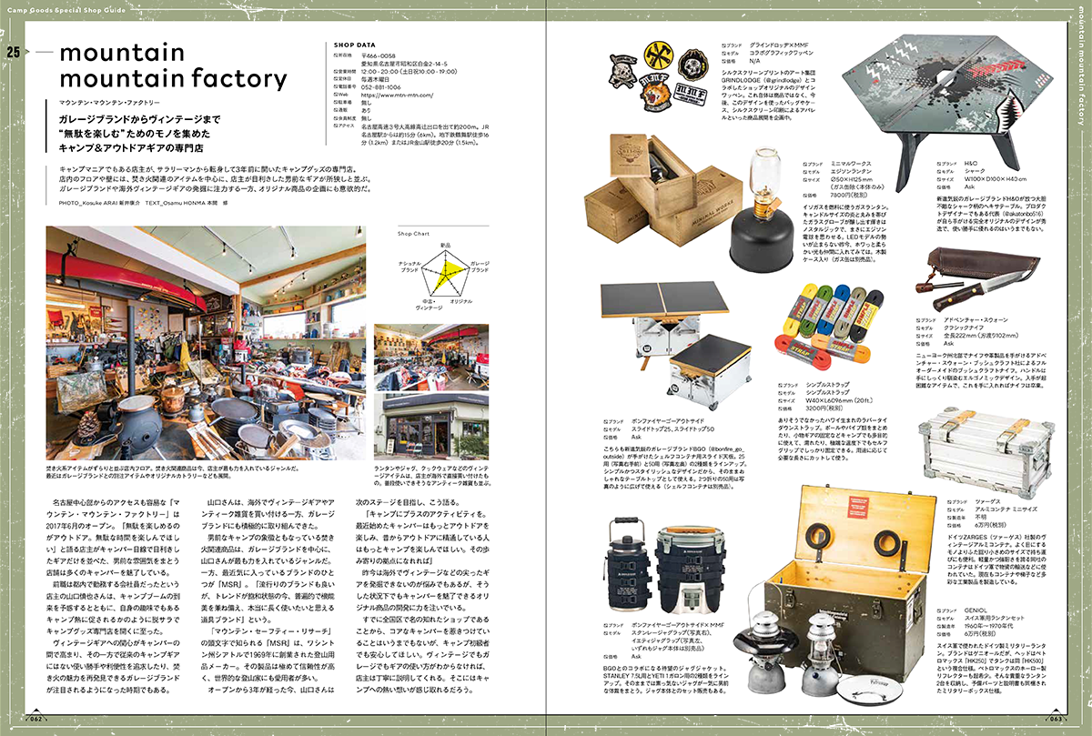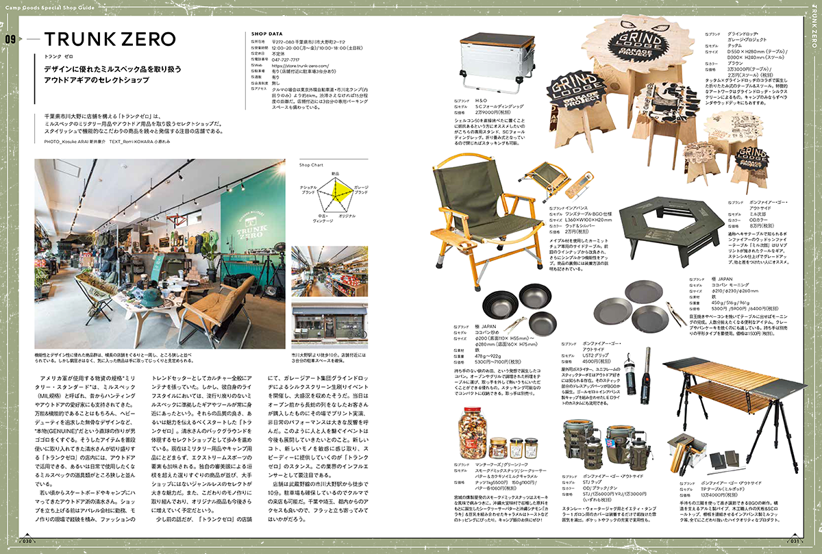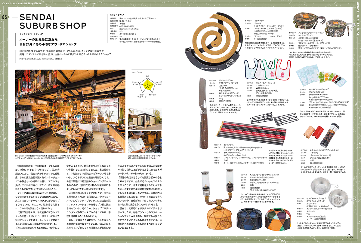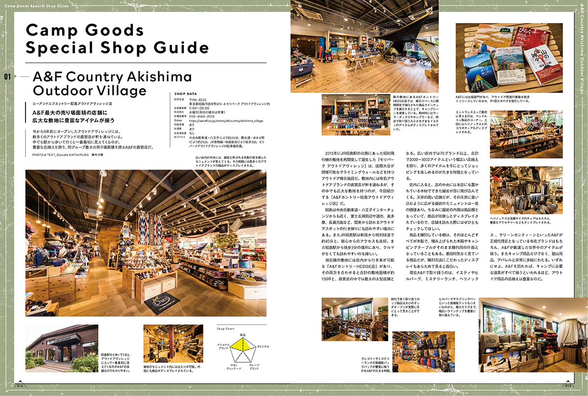 今回発売する「キャンプグッズ・マガジン vol.14」は、全国のキャンプ道具専門店を60店舗を掲載。店舗の商品カテゴリーから実際に取り扱っている商品まで、まるで誌面上でウインドウショッピングしているかのように楽しめます。