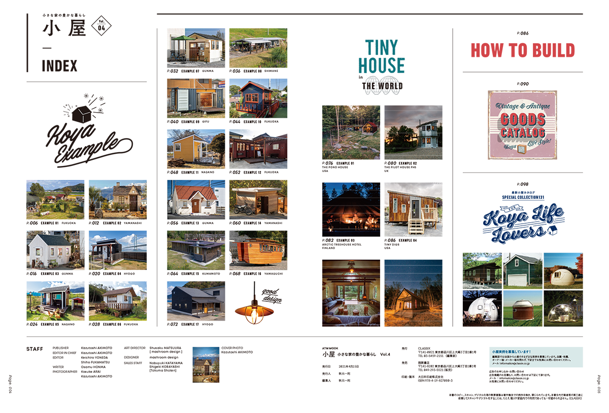 今回も北欧やイギリス、アメリカなどで実際に使用されているさまざまなタイプの小屋(TINY HOUSE)をはじめ、福岡、熊本、島根、山口、兵庫、岐阜、山梨、長野、群馬などに建築された国内17の小屋など、合計20以上の小屋をご紹介しています。