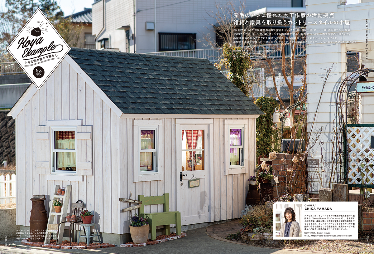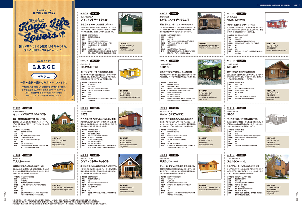 さらに小屋が完成するまでの工程や、小屋ライフにぴったりなアンティーク&ヴィンテージ小物80点。合計131スタイルの小屋をサイズ別にカタログ展開した「最新小屋カタログ131」など、これから小屋の建築を検討している方には必携の1冊となっています。