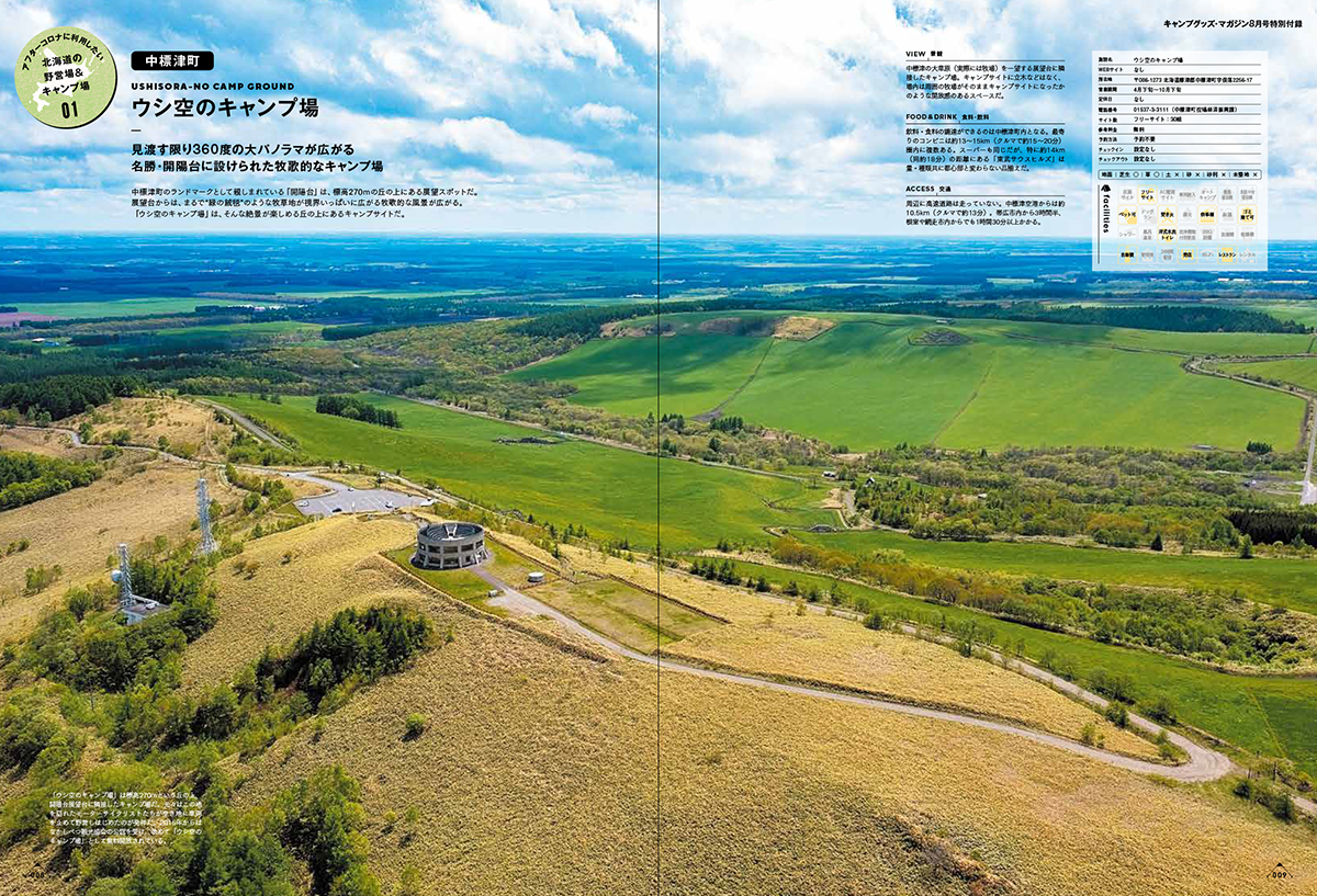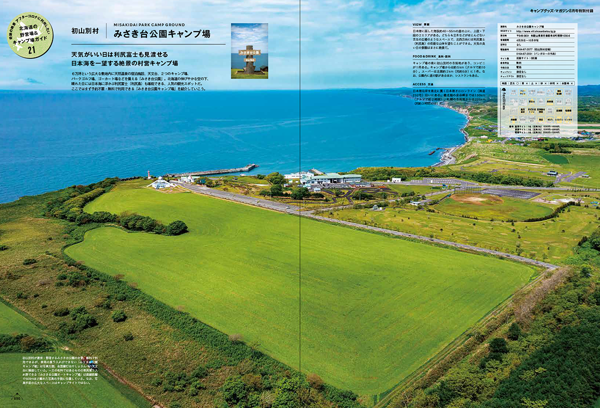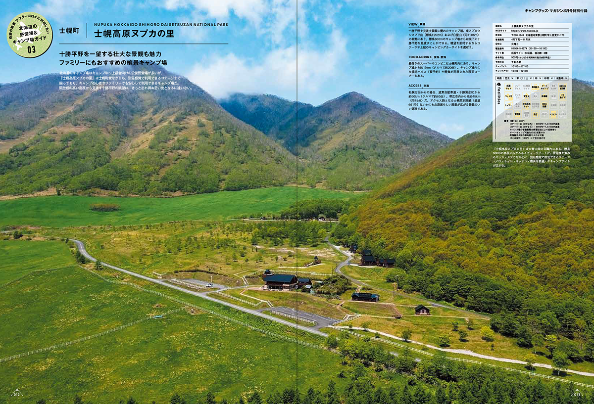 また、特別付録として「北海道の野営場&キャンプ場ガイド」(A4版・全76ページ)を同梱。北海道の魅力的なキャンプサイトを合計34ヶ所掲載した特別付録は、まさに永久保存版の1冊といえます。