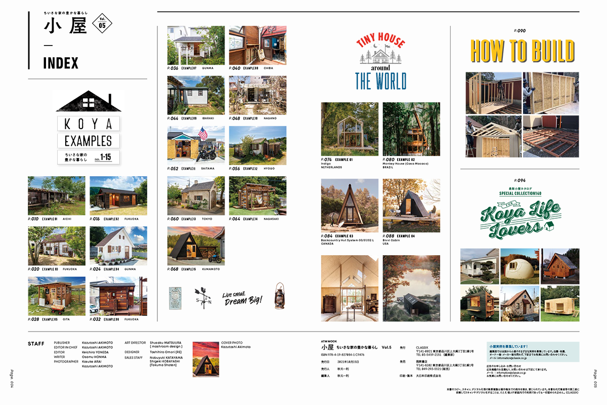 今回もオランダやブラジル、カナダなどで実際に使用されているさまざまなタイプの小屋(TINY HOUSE)をはじめ、愛知、群馬、福岡、熊本、兵庫、茨城、千葉、埼玉などに建築された国内15の小屋など、合計19の小屋をご紹介しています。