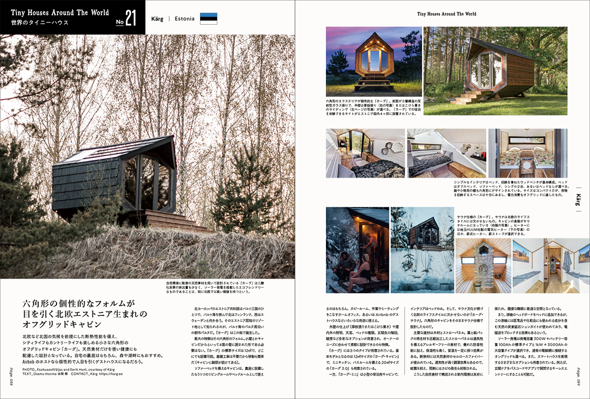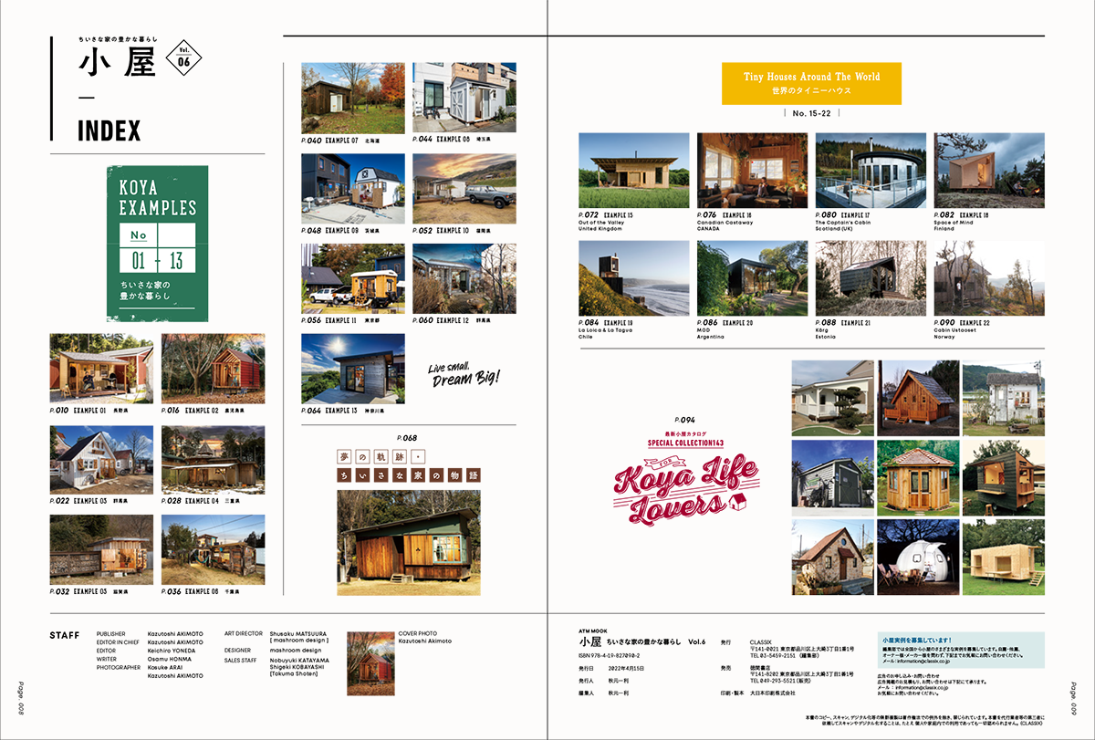 「小屋 ちいさな家の豊かな暮らし vol.06」は、国内外の素敵な小屋を取り上げた数少ない専門誌のひとつ。今回もフィンランドやイギリス、チリなどで実際に使用されているさまざまなタイプの小屋(TINY HOUSE)8例を収録。国内では北海道、茨城、千葉、三重、滋賀、福岡、鹿児島などに建築された小屋など、合計14の小屋をご紹介しています。