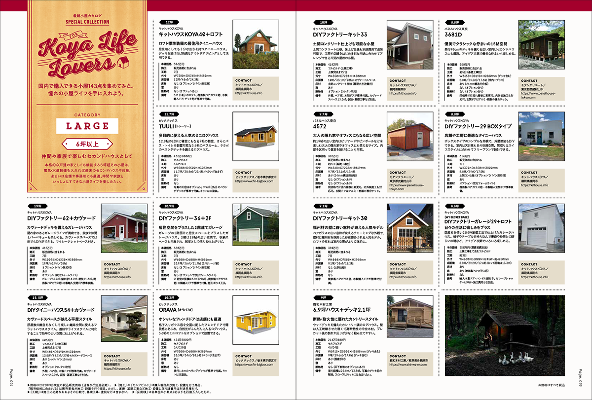 さらに合計143スタイルの小屋をサイズ別にカタログ展開した「最新小屋カタログ143」など、これから小屋の建築を検討している方には必携の1冊となっています。