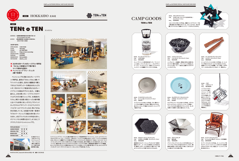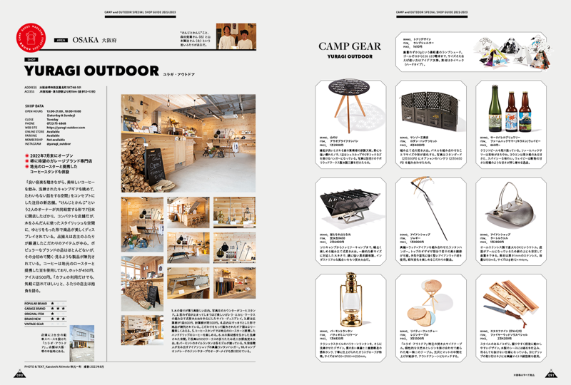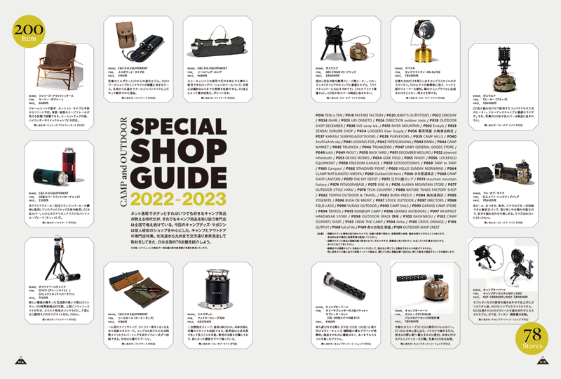 チョイスした店舗は大手量販店なみの品揃えを誇る人気店舗から、ソロキャンプ専門店やトレラン専門店など、特色のあるユニークな専門店ばかり。中には“関西エリア最小級”“自称癖の強い店主のいる店”など、読んでいるだけでも楽しくなるような店舗がズラリと並んでいます。