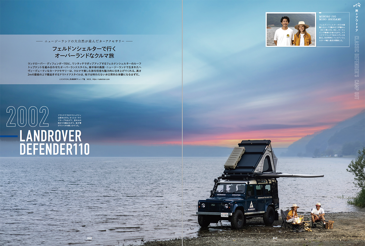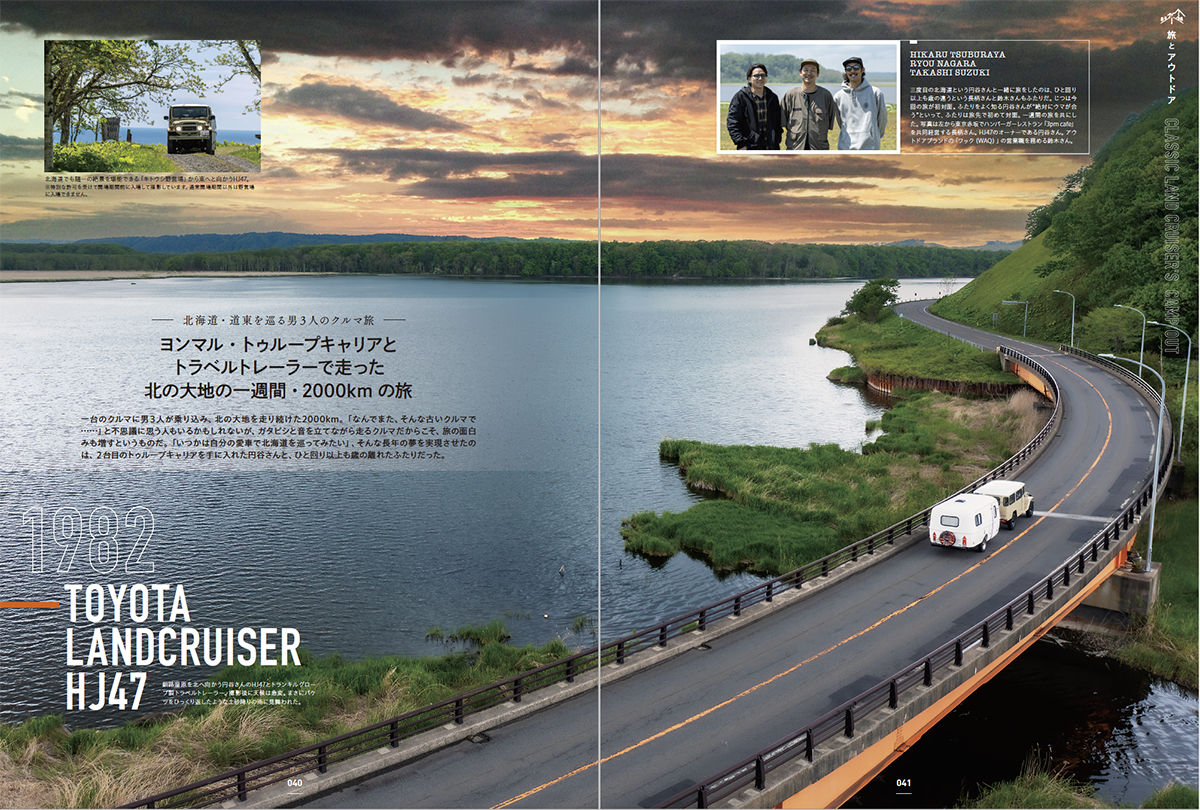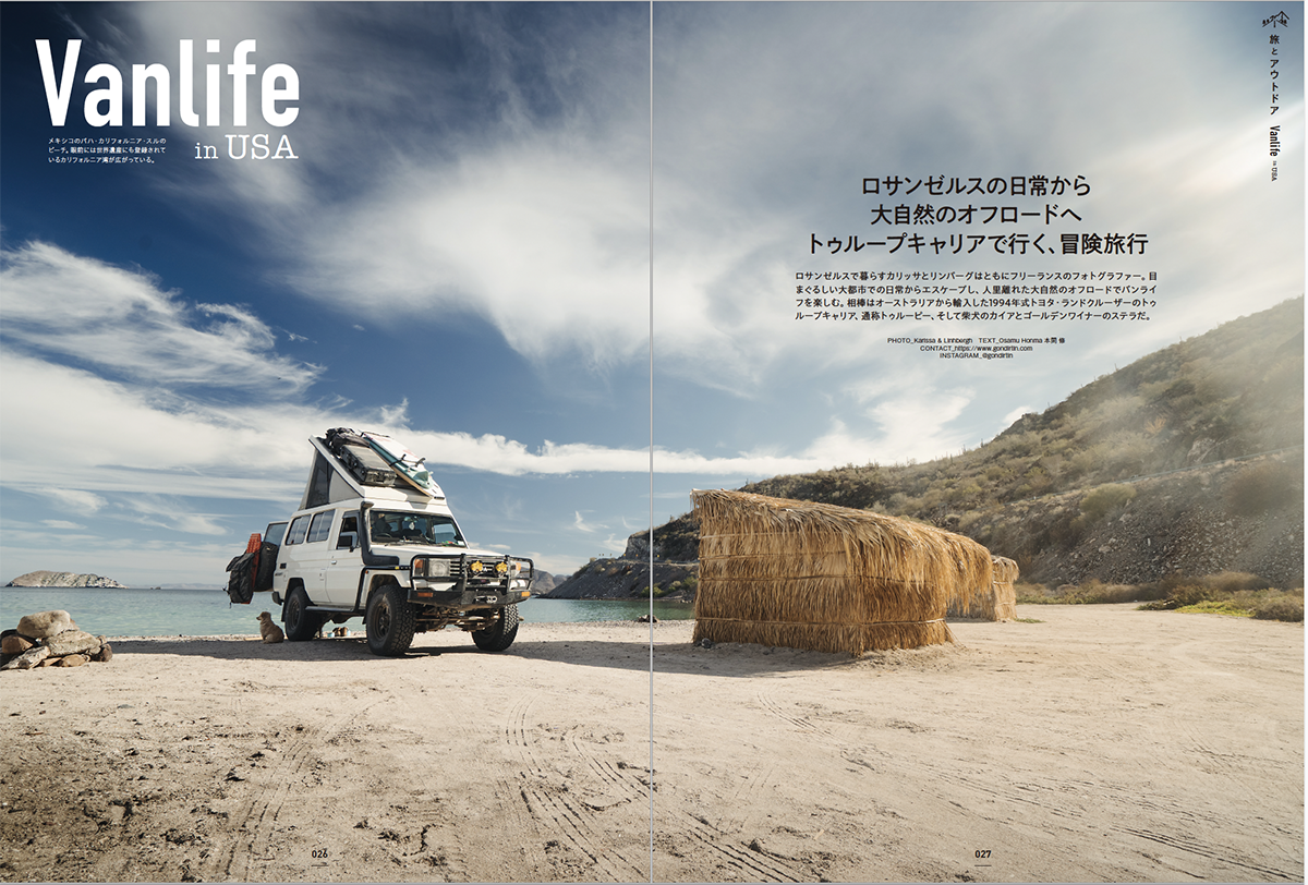 「旅とアウトドア」では家の中でも外でも使える最新のキャンプ用品や、キャンパーたちが実際に愛用するツールなどのギア類を掲載。LA、北海道などでアウトドアと旅を楽しむバンライフなど、スケールの大きな旅も紹介しています。