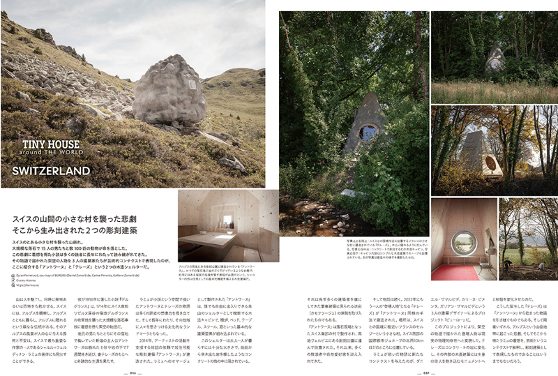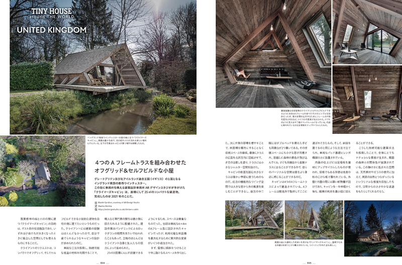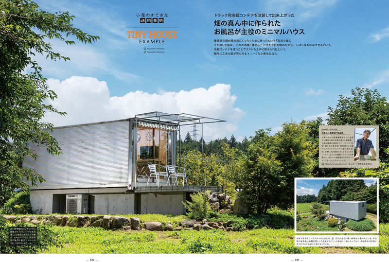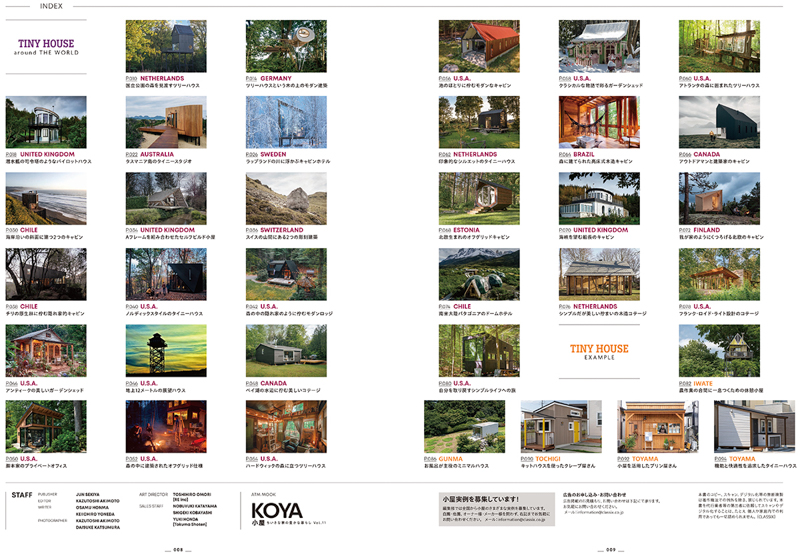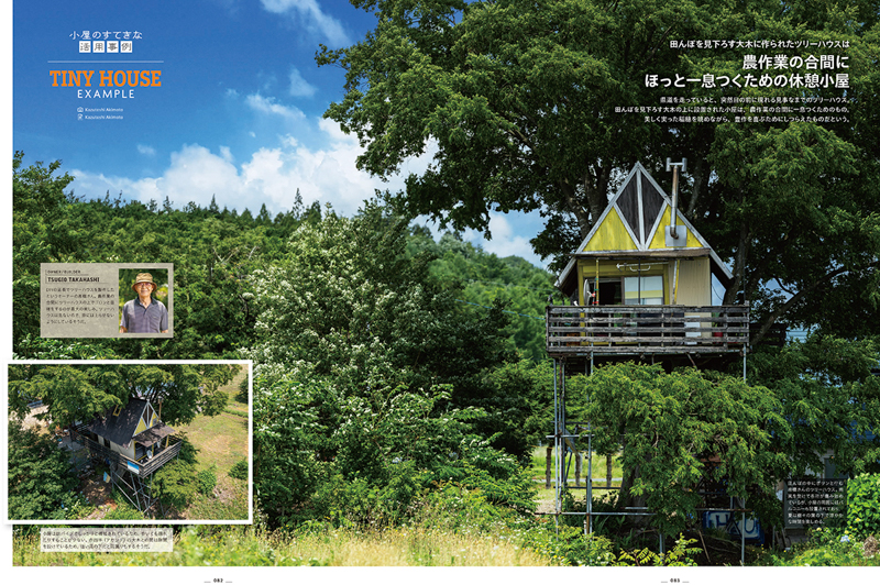 さらに日本国内からは手作りで完成させたツリーハウスや、コンテナを活用したお風呂ハウス、さらに小屋を活用したビジネス使用などの実例5件を加え、一冊で合計35件の小屋を掲載しています。