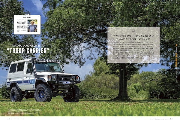 クラシックモデル“ヨンマル”のレストマニュファクチャリングから、完璧なレストレーションの施された“ロクマル”。さらに再再販されたばかりの“ナナマル”の最新カスタムスタイルや、アウトドアスタイルにぴったりの“新旧トゥループキャリア”など、全ページがランドクルーザーオンリー。