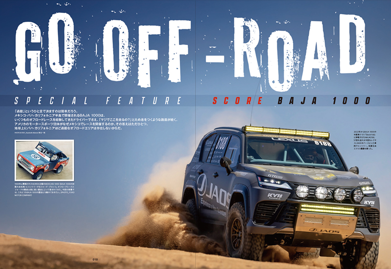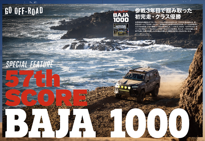 BAJA 1000に3年連続で出場し、2024年に初完走・クラス優勝を飾ったTEAM JAOSを中心にしながら、BAJA 1000の歴史や参戦車両について合計40 ページもの大特集としています。
